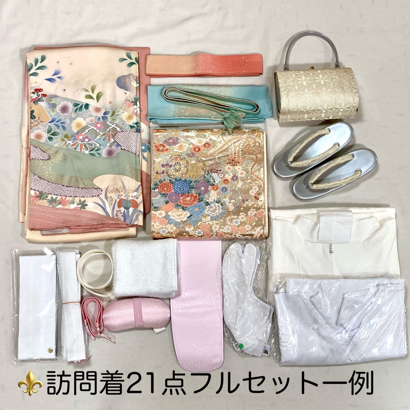 着物・袋帯・帯揚げ・帯締め・重ね衿・帯板・衿芯・着物ベルト・伊達締め・腰紐・長襦袢・スリップ・足袋・草履・バッグ